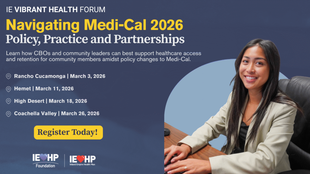 In collaboration with Inland Empire Health Plan (IEHP), the IE Vibrant Health Forums: Navigating Medi-Cal 2026: Policy, Practice, and Partnerships will equip local leaders and partners with knowledge, tools, and connections to respond to these changes.